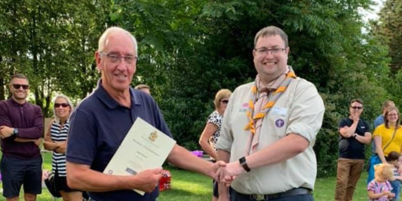 At their recent AGM and end-of-term Party in the Park, John Turner, Chairman of 1st Fairfield Park Scout Group, received a five-year service award from Biggleswade District Commissioner Rob Pullinger. John was appointed chairman at Fairfield in 2014 but his scouting service record goes back over 40 years.