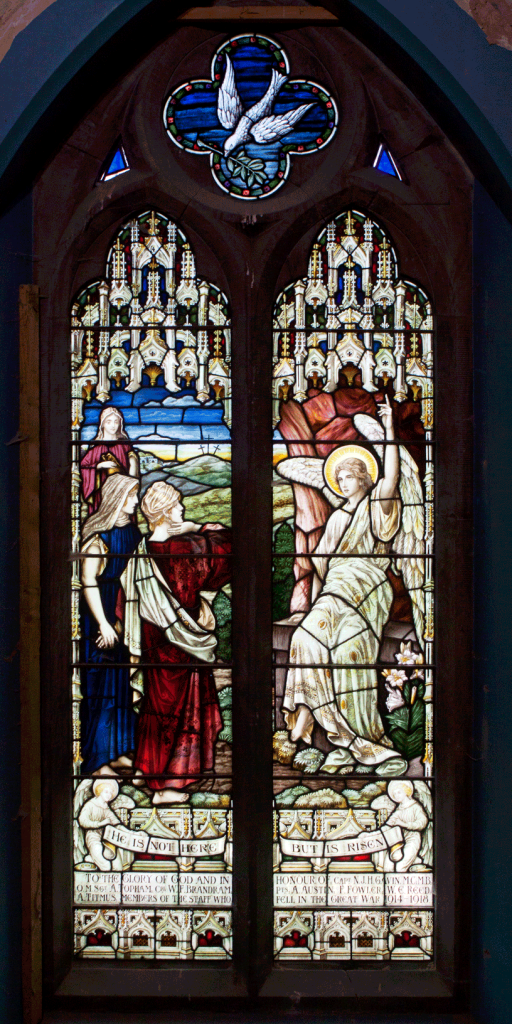 The windows in the former St Luke’s Chapel have recently been uncovered in preparation for renovation work as part of the building’s conversion to four luxury homes. The stained-glass window shown above is the central one of three at the east end of the chapel, and was installed around 1920 in memory of the staff who gave their lives in the First World War. Its dedication reads: To the Glory of God and in honour of Capt N J H Gavin, MC, MB, OM, Sgt A Topham, Cpl W F Brandram, Pts A Austin, F Fowler, W E Reed, A Titmus. Members of the staff who fell in the Great War 1914–1918.