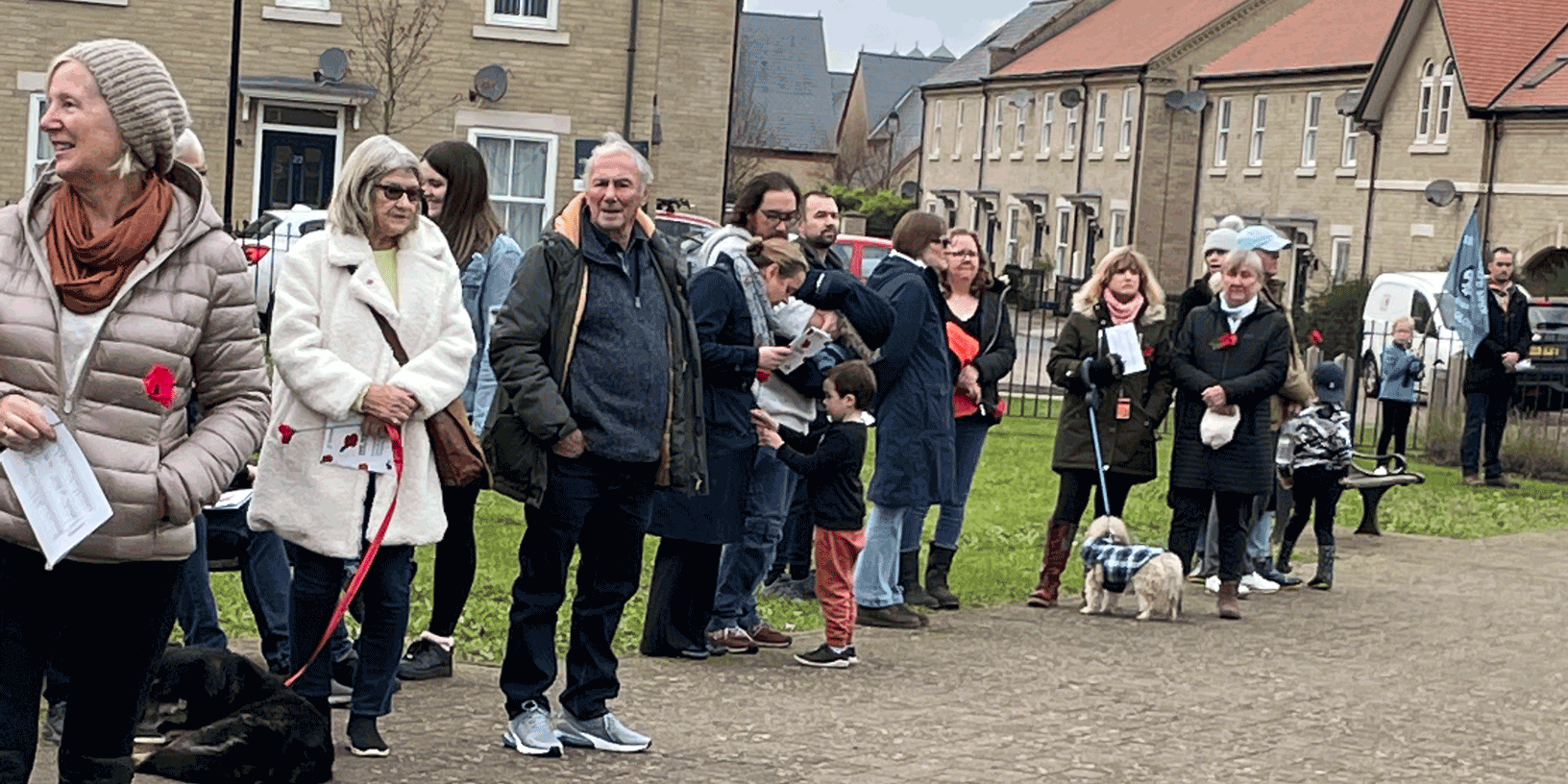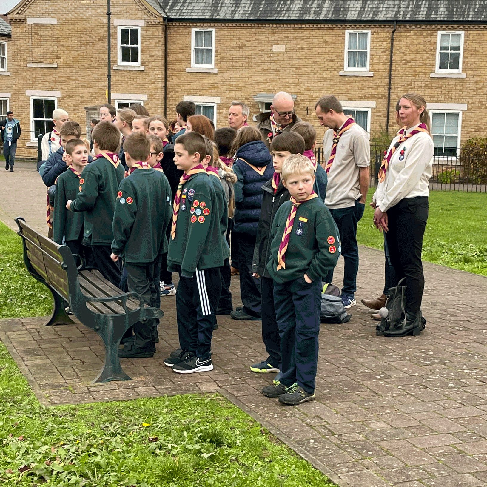 The uniformed groups at Fairfield presented their colours, and wreaths were laid on behalf of Central Bedfordshire Council, Fairfield Parish Council, the Fairfield management companies, Fairfield Community Church, Fairfield Bowls Club, Fairfield WI and the Fairfield Scouts. After this everyone was invited to come forward to lay their own poppies on the ground and pause to remember those who have served their country with their life. A collection for The Royal British Legion was held before and during the service