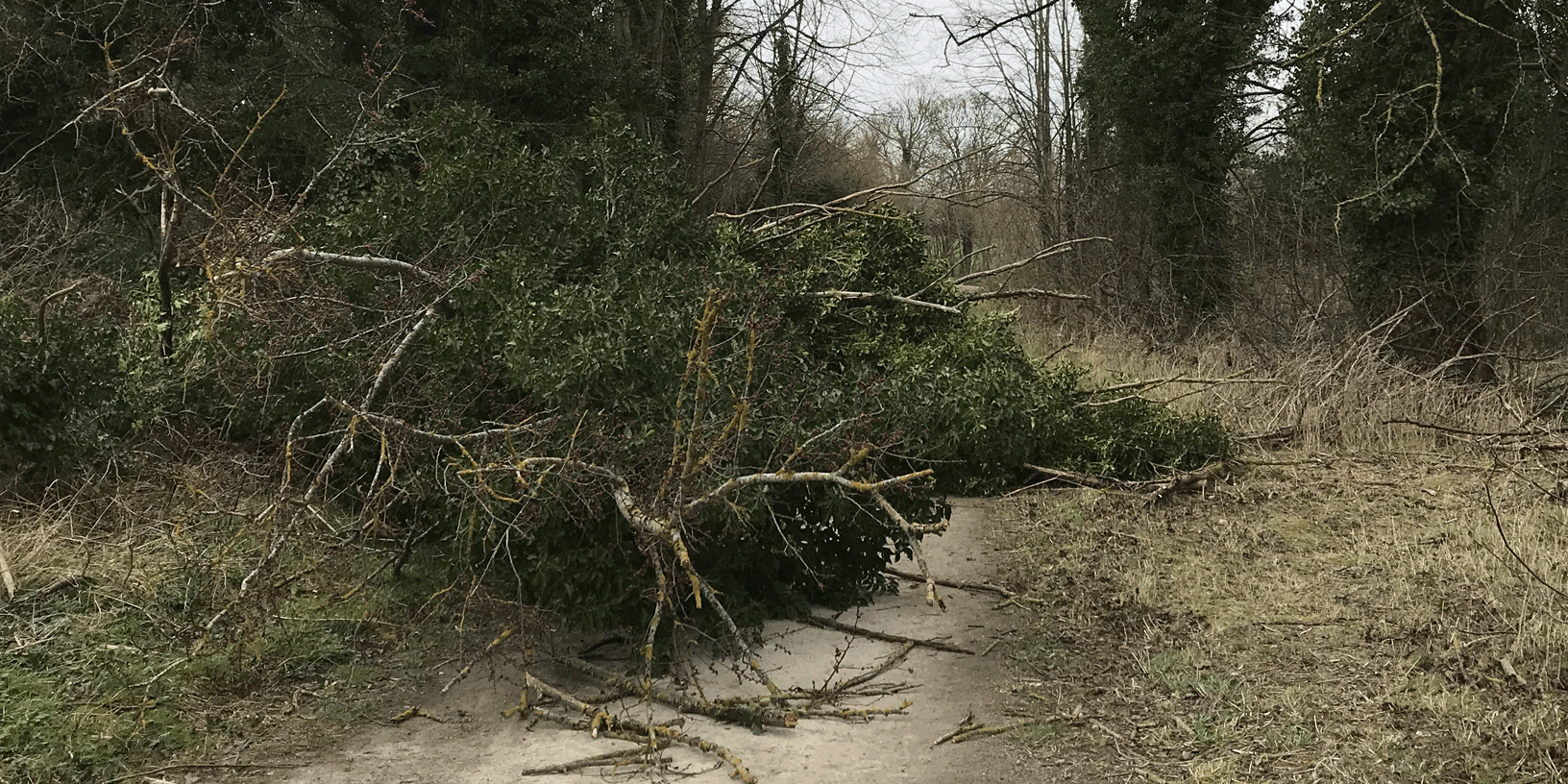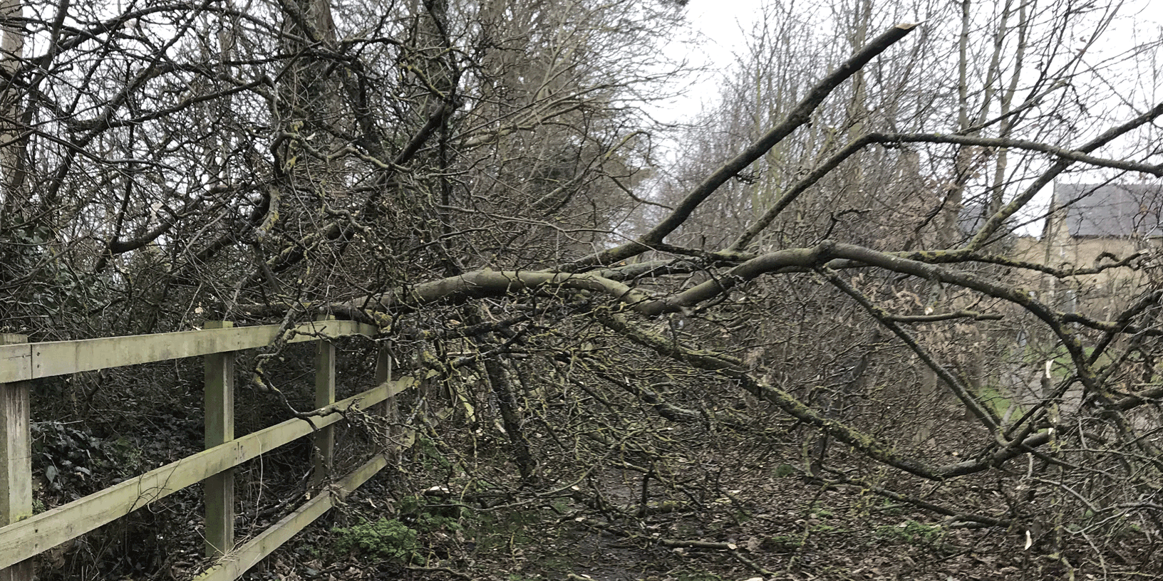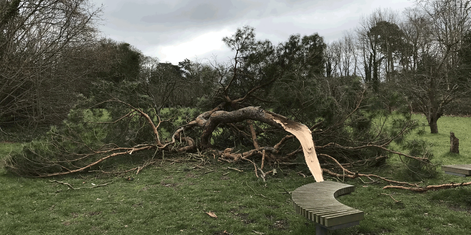 Although most of the trees in Fairfield weathered the onslaught of storms Dudley–Eunice–Franklin admirably, there were a few notable exceptions. The bridleway around Fairfield Park’s southeast corner was blocked by several fallen trees, and the West Drive took a couple of hits. The most dramatic loss was probably the large limb of Scots pine in the West Orchard, which fell very close to the seating area – luckily overnight, when it wasn’t in use.