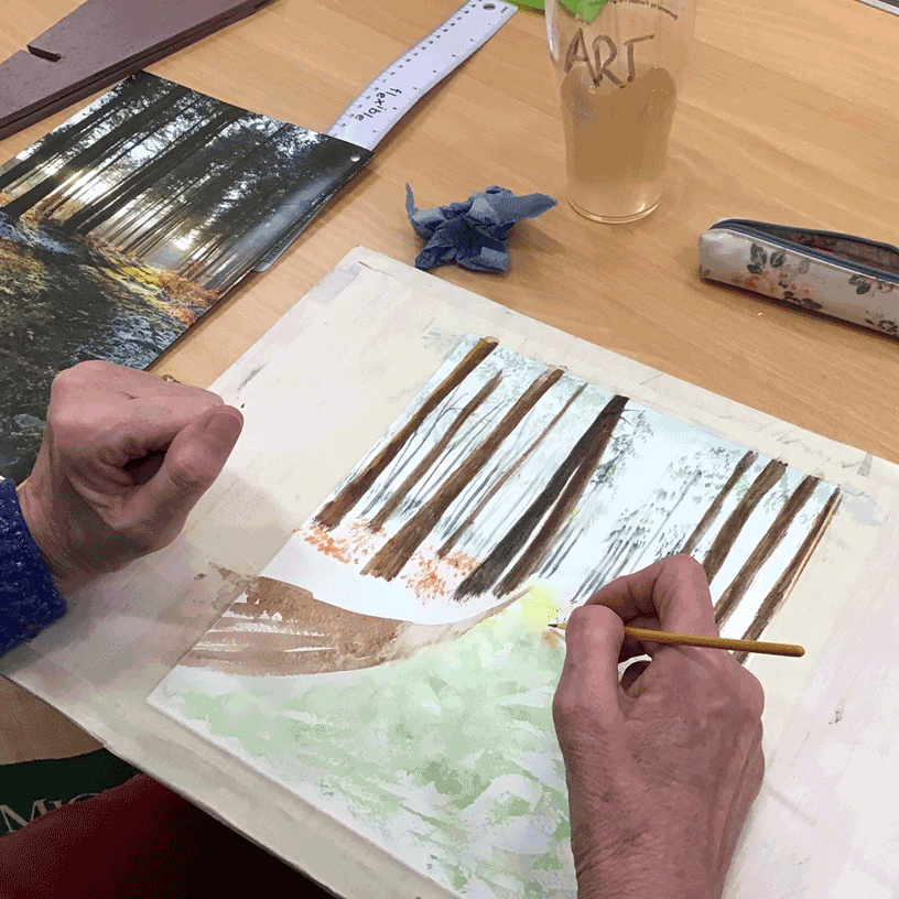 At the first session of the new year we welcomed back three group members who haven’t been for some time. We started with a short demo by me on the Monthly Theme of Trees. I showed the group how you paint negative spaces. After that everyone went on with their work – some photos of which I am sharing. In February the theme will be Water and John Johnston will give the demo on Monday 6 February. We are always keen to welcome new artists, so if you’re inspired by what you see, get in touch or come along.