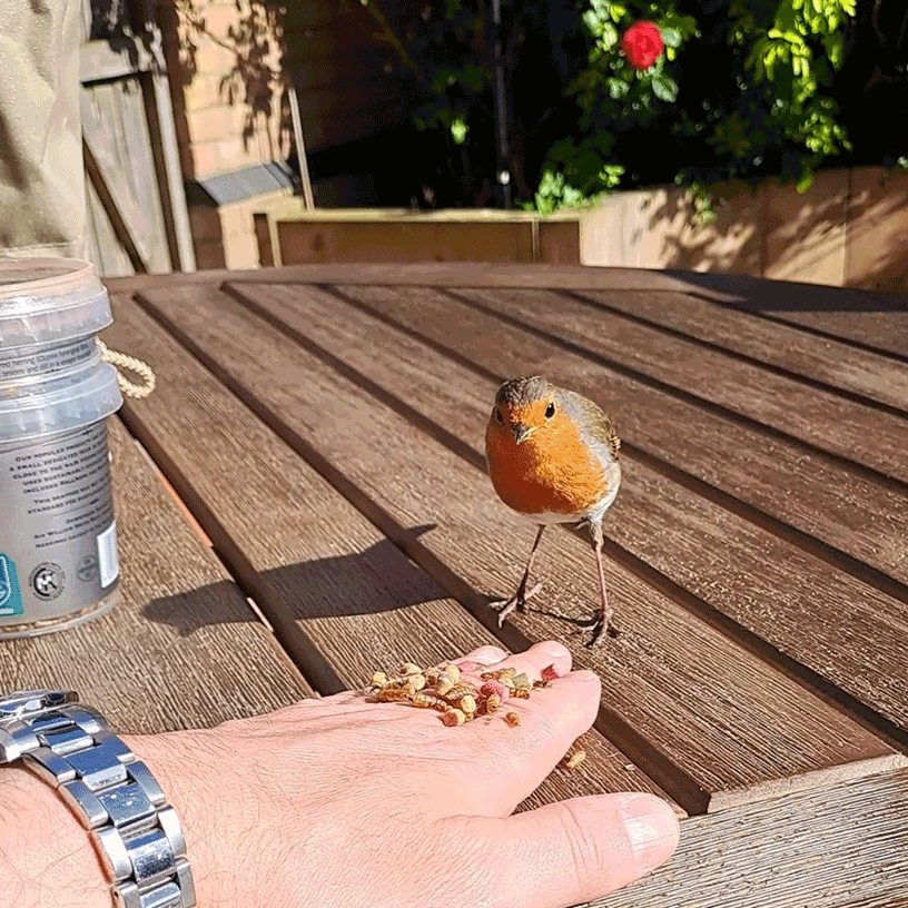 Start by putting a few mealworms on a tray or dish in the garden and then go back inside. Once a robin takes these, it should return in the hope of finding more. After a couple of days of this, when the robin knows the food source is reliable, you can sit very still in a chair in the garden some distance from the food and let the robin get used to your presence. As the days go by, place the food closer and closer to your chair, eventually putting it onto a garden table near you, if you have one – always remaining still or moving very slowly. And so, day by day, your robin will gain confidence in being close to you until, hopefully before too long, it’ll be eating from your hand.