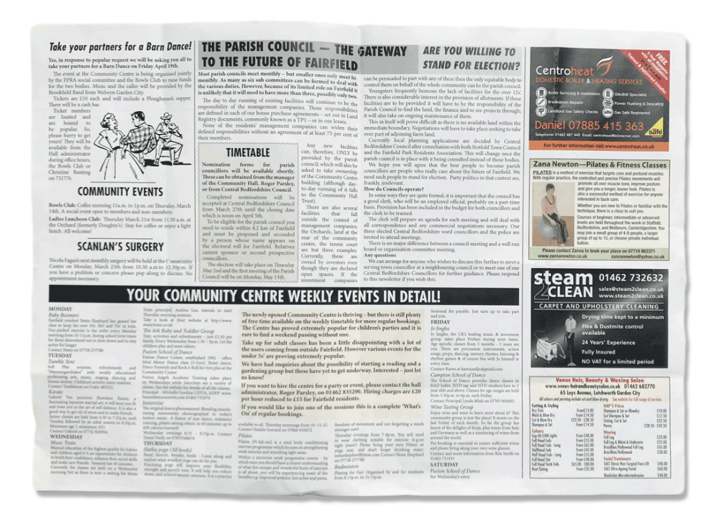 Early issues of FM were printed on a single A3 sheet, folded to make an A4 booklet. Back then there was a narrower focus – the formation of the parish council and attracting people to the new community hall were the key issues – and it was important that the same information reached everyone. Now, in addition to council news and community events, our website offers us the opportunity to cover a wide range of subjects and stories from across the community – and you can follow as much or as little of it as you like.