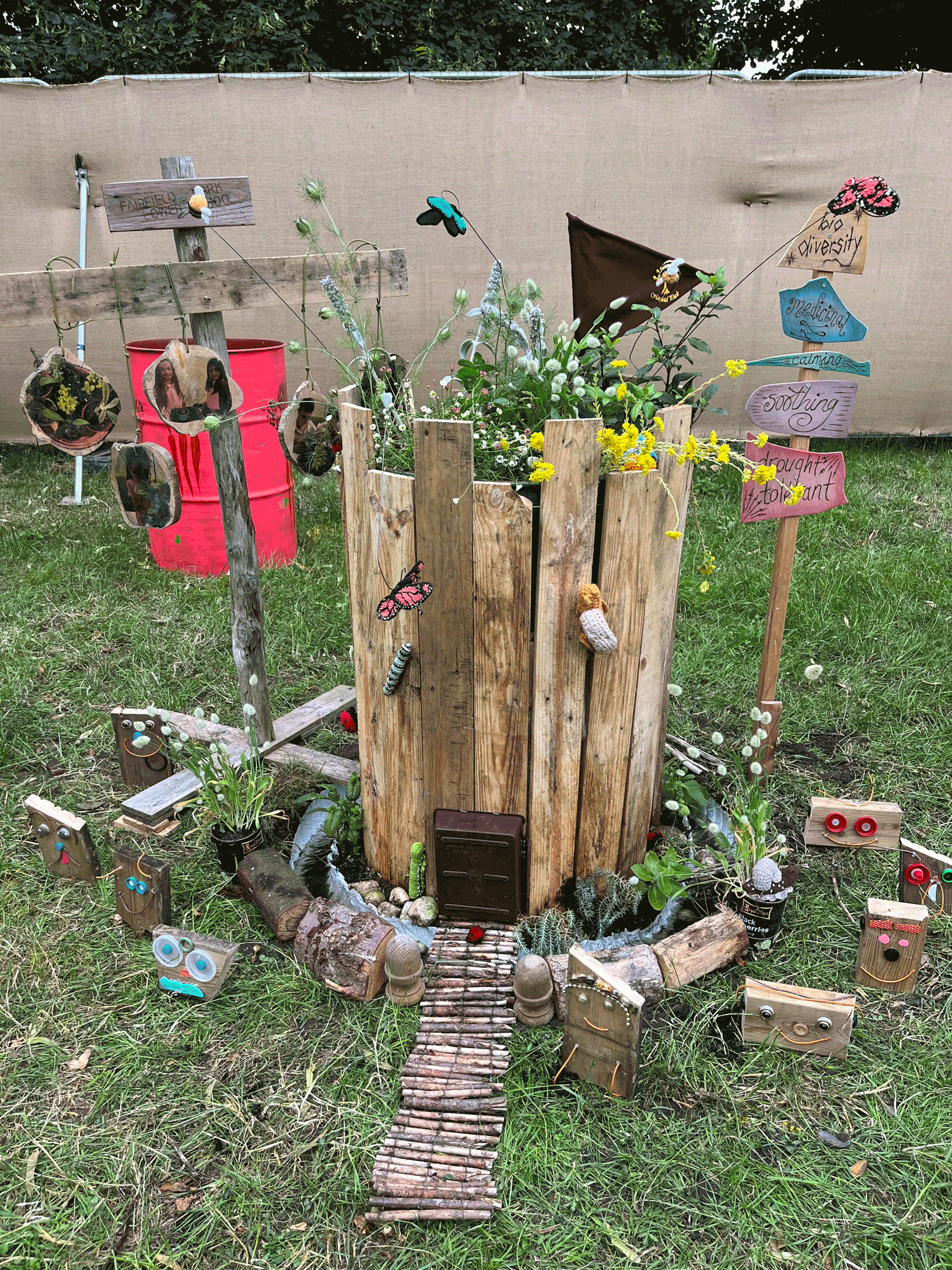 SF: Well, the project is all about pollinators and biodiversity, so the aim was to show that and teach other people about it. We came up with a design together as a group, and the whole theme is that it’s a castle. So we wrapped our barrel in wood to look like a castle, and we had a moat, and then up at the top there’s the pollinators and the plants. We chose plants that we can use for medicinal, healing purposes. So the plants look after us. But then in turn we need to look after the plants and the bees and the bugs – so it’s a really nice cycle.