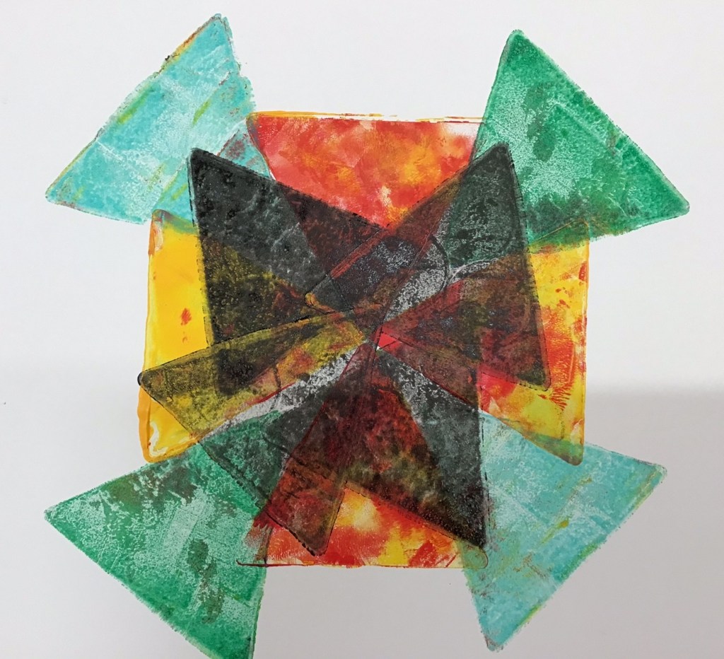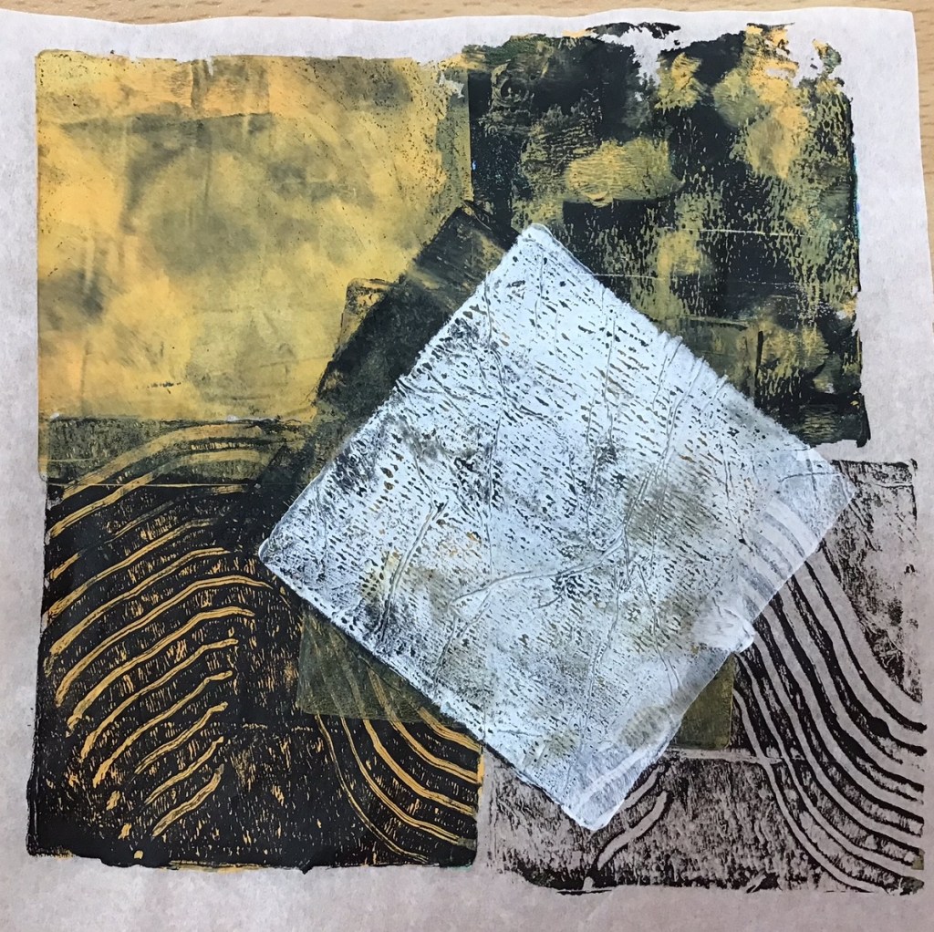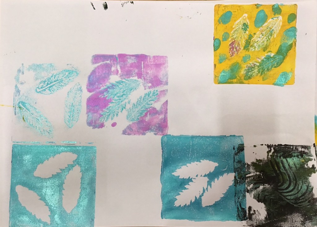 Gel Plate Printing is a simple way to create interesting monoprints without the expense of a printing press. At the art group this month, Val showed the others how to use a gel plate and some of the different techniques that can be used. She shared some examples of her own prints, which may be used for card making or collage, or as a small original to mount and frame.